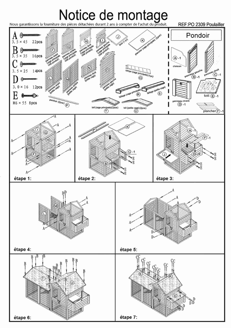 Pour un nettoyage efficace, le poulailler est fourni avec un tiroir à déjection coulissant vers l'extérieur. La volière possède un double toit bitumé ce qui permet de protéger les poules des intempéries.