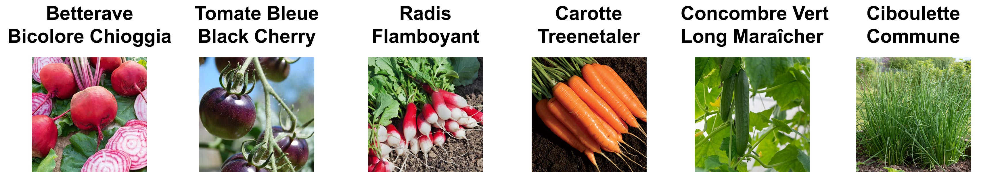 Sachets de graines * | - La Betterave Bicolore Chioggia (120 graines) - La Tomate Bleue Black Cherry (30 graines) - Le Radis Flamboyant 2 (3,5 grammes) - La Carotte Treenetaler (2 grammes) - Le Concombre Vert Long Maraîcher (20 graines) - La Ciboulette Commune (1 gramme) |