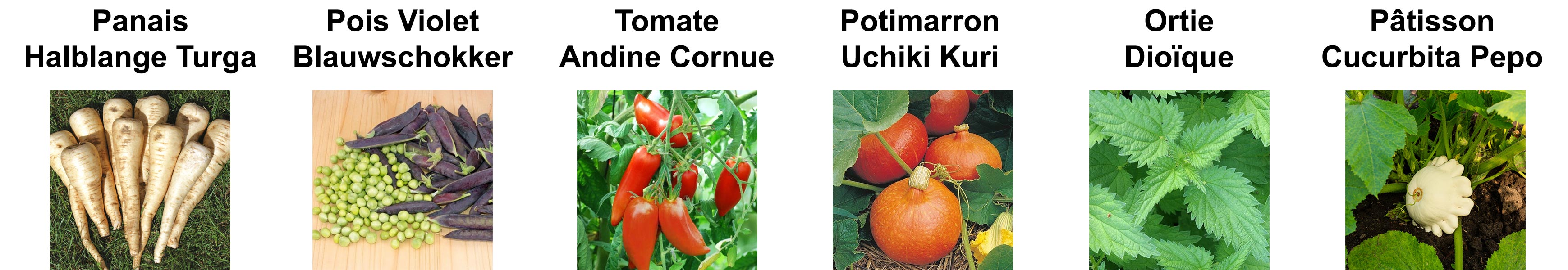 Sachets de graines * | - Le Panais halblange turga (2 grammes) - Le Pois Violet Blauwschokker (60 graines) - La Tomate Andine Cornue (30 graines) - Le Potimarron Uchiki Kuri (10 graines) - L’ortie Dioïque (500 graines) - Le Pâtisson Cucurbita Pepo (12 graines) |