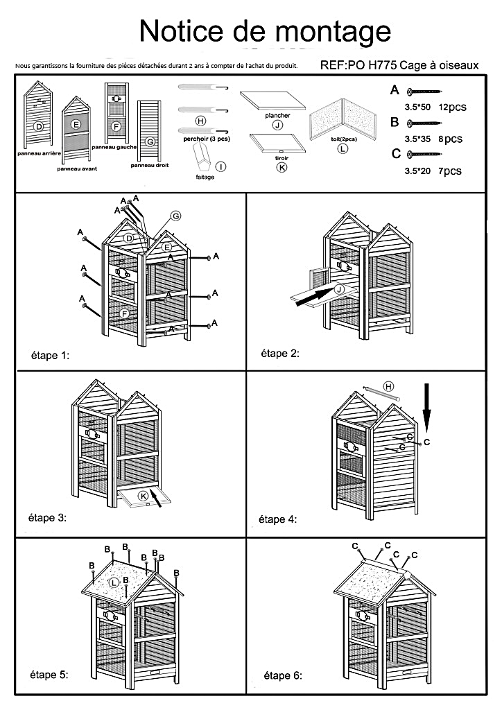 La cage est équipée d'une porte de passage, d'une trappe, de 3 perchoirs ainsi que d'un tiroir à déjections galvanisé permettant un nettoyage facile et rapide.